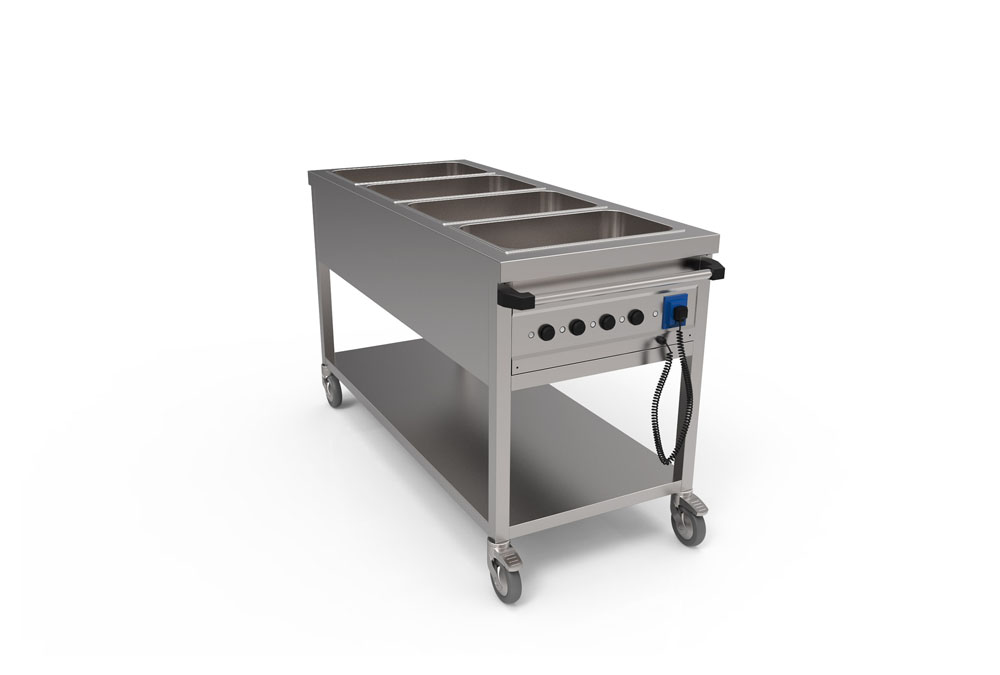 Edelstahlausführung mit 4 tiefgezogenen, einzel naß - beheizbaren Warmhaltebecken für max. GN-Behältertiefe 200 mm - Jedes Warmhaltebecken mit außenliegenden Heizelementen und Kugelablasshahn nach unten, Wasserbefüllung manuell - stufenlose thermostatische Temperaturregelung von 0°C bis +90°C